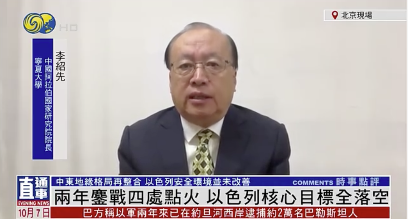 2025年10月7日,我院名誉院长、中国中东学会顾问、教育部国别与区域研究专家委员会委员、中阿博览会顾问委员会主任委员李绍先接受了中央电视台、凤凰卫视采访,就当前局势进行了分析和解读。