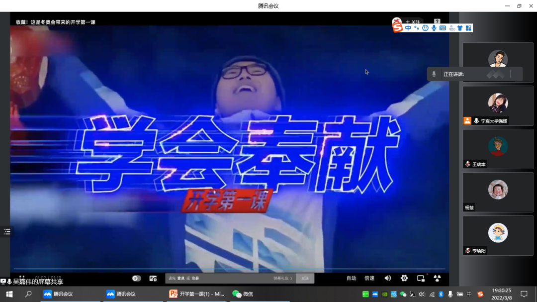 学院研究生会组宣部负责人吴嘉伟带领大家观看了短视频“冬奥带给我们的开学第一课”并进行发言。他谈到,冬奥赛场上,无数拼搏的身影,是奥林匹克精神最好的诠释。无论是“自信自强,坚持到底”的任子威、“战胜恐惧,挑战自我”的谷爱凌、“万事皆可期,努力终不负”的苏翊鸣、“冲破陈规,挑战巅峰”的羽生结弦,每个人都在用不懈的努力向世界证明--------“生活中重要的不是凯旋,而是奋斗!”作为一名研究生,我们应该在学习中保持不怕困难、不畏挑战的精神与勇气,用丰富的知识武装自己,用优异的成绩展现自己!