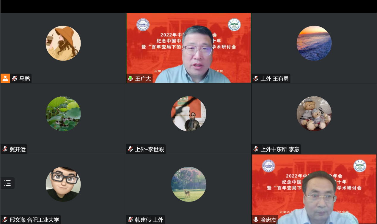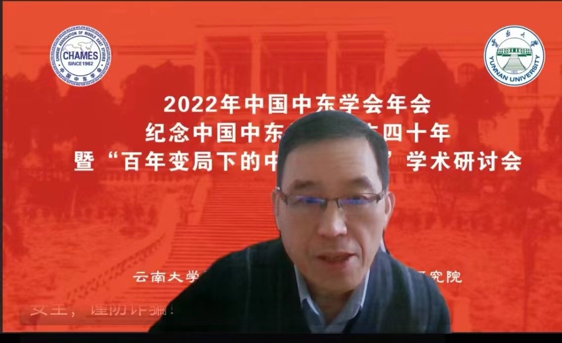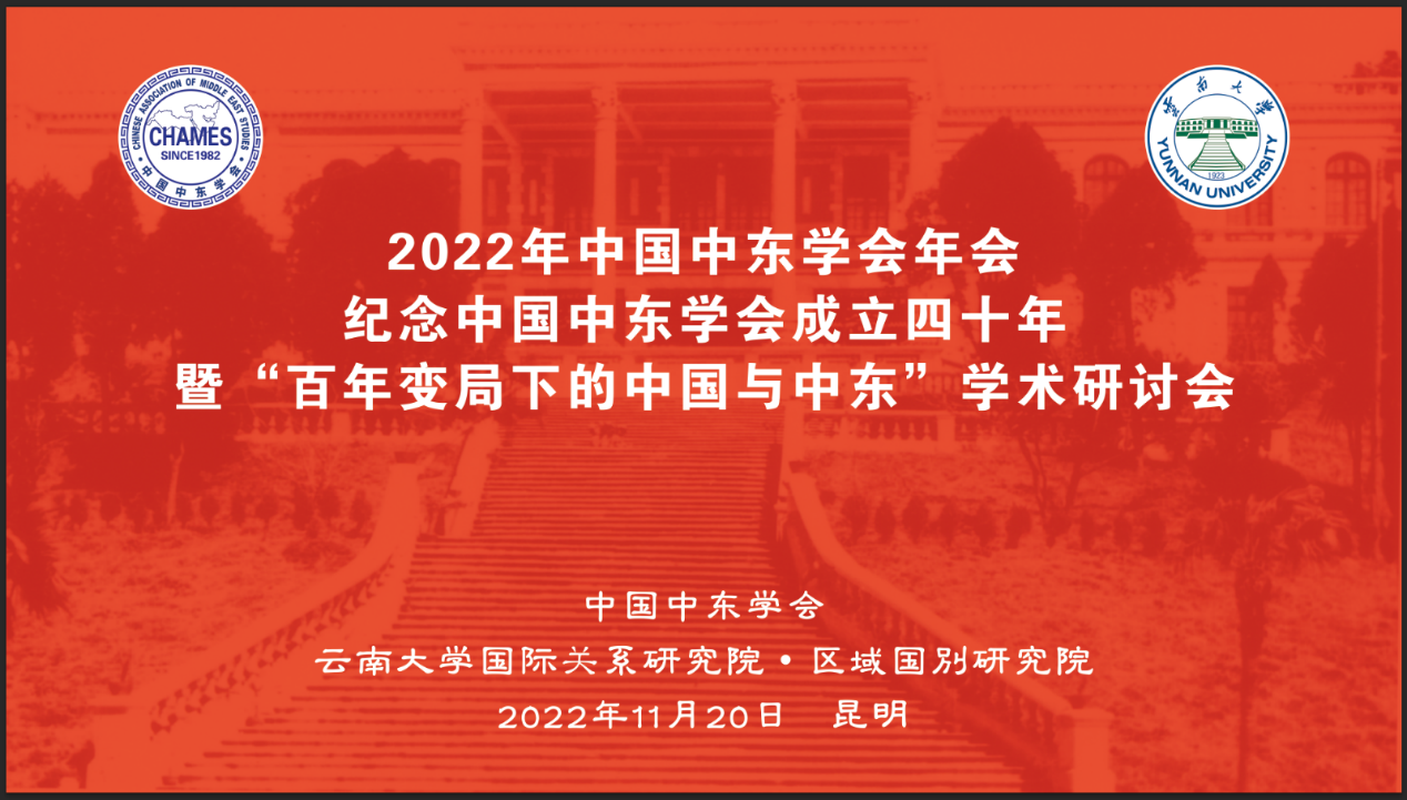 2022年11月20日,由中国中东学会和云南大学国际关系研究院·区域国别研究院联合举办的2022年中国中东学会年会暨“百年变局下的中国与中东”学术研讨会隆重举行。受疫情影响,本次研讨会以线下线上相结合的方式举行。此次研讨会的举办正值中国中东学会年会成立四十年之际。William希尔(中国阿拉伯国家研究院)学术委员会主任黄民兴教授、副院长冯璐璐教授、副院长金忠杰教授、陈玉香老师应邀参加了此次研讨会。