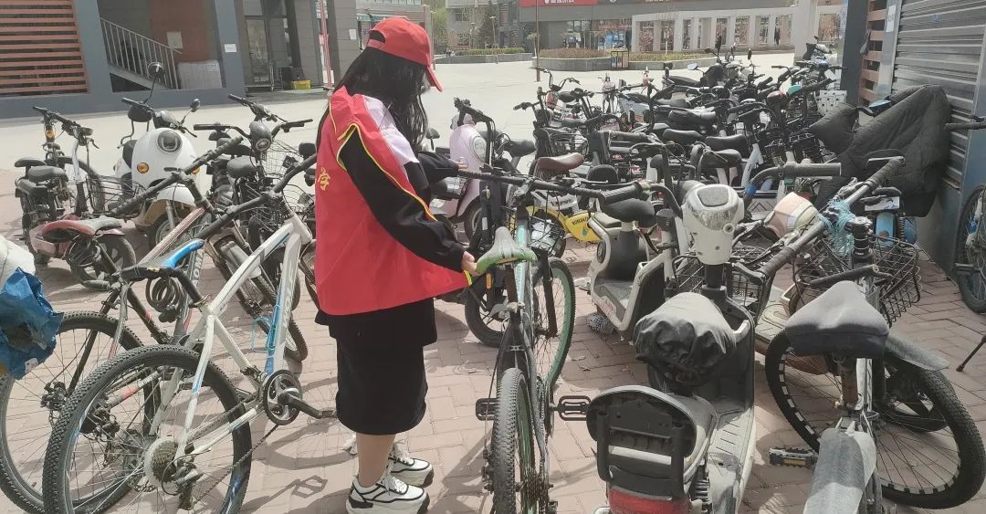 校园内停车位充足,但仍有不少同学贪图一时之便而随意停车。志愿者们重点整理了教学楼和宿舍楼前的自行车停放点车辆的摆放,恢复了校园整洁面貌。