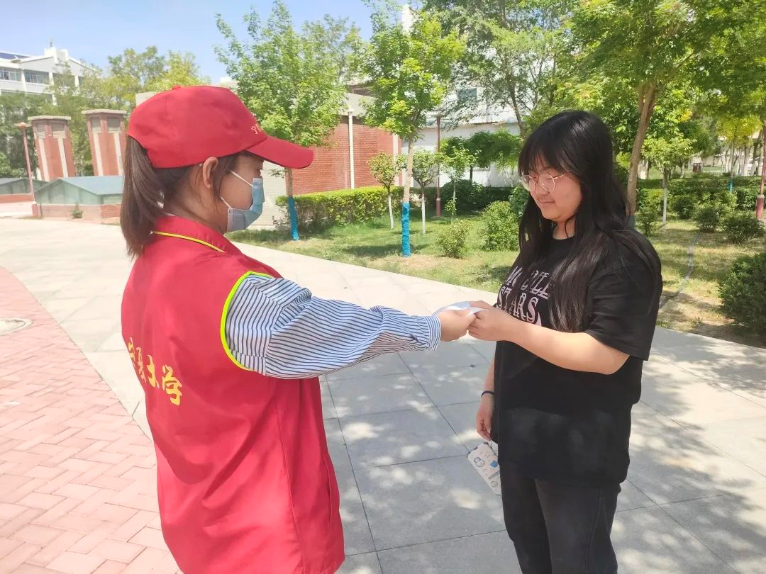 在本次活动中,志愿者们分组行动,在校园内四处巡逻,友情提醒广大师生校内出行要戴好口罩、不聚集、不随地吐痰、相互之间保持一米以上安全距离等疫情防控知识。同时,志愿者们在校园内进行文明监督,提醒同学们规范佩戴口罩、给未佩戴口罩的同学分发口罩,有效督促了同学们养成良好的疫情防控习惯。